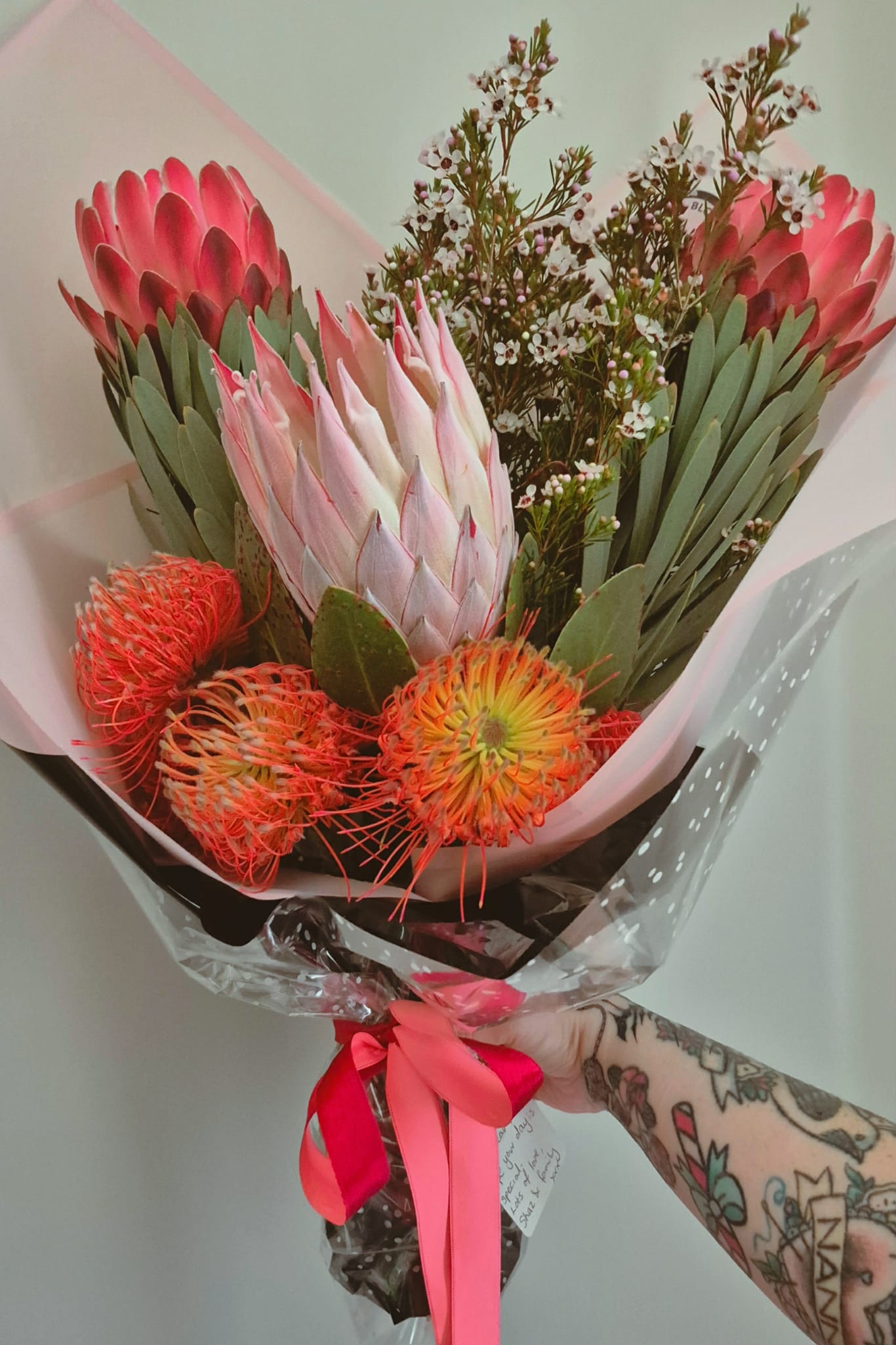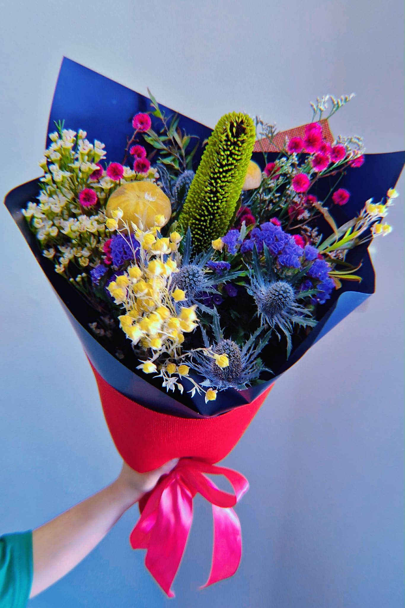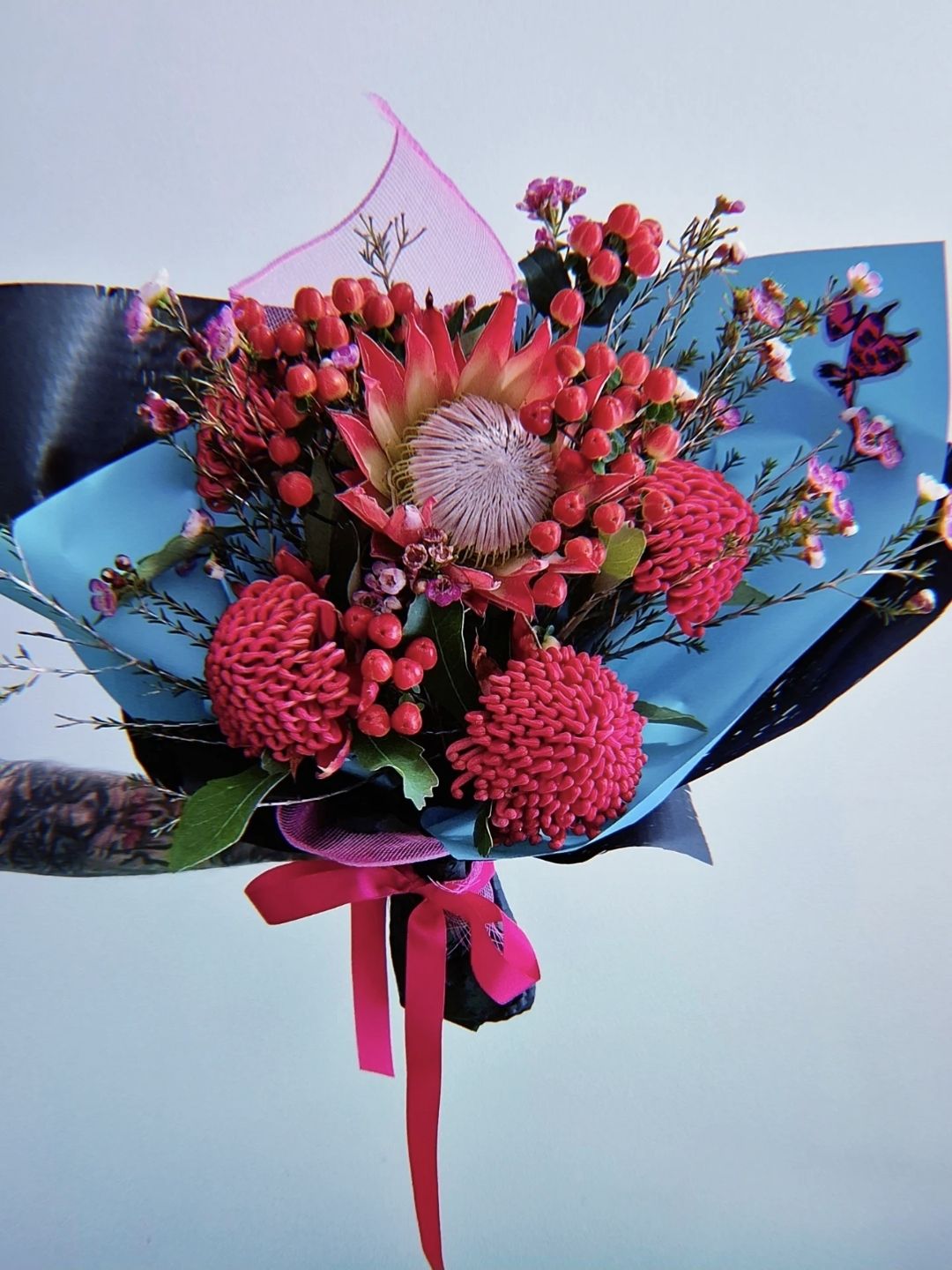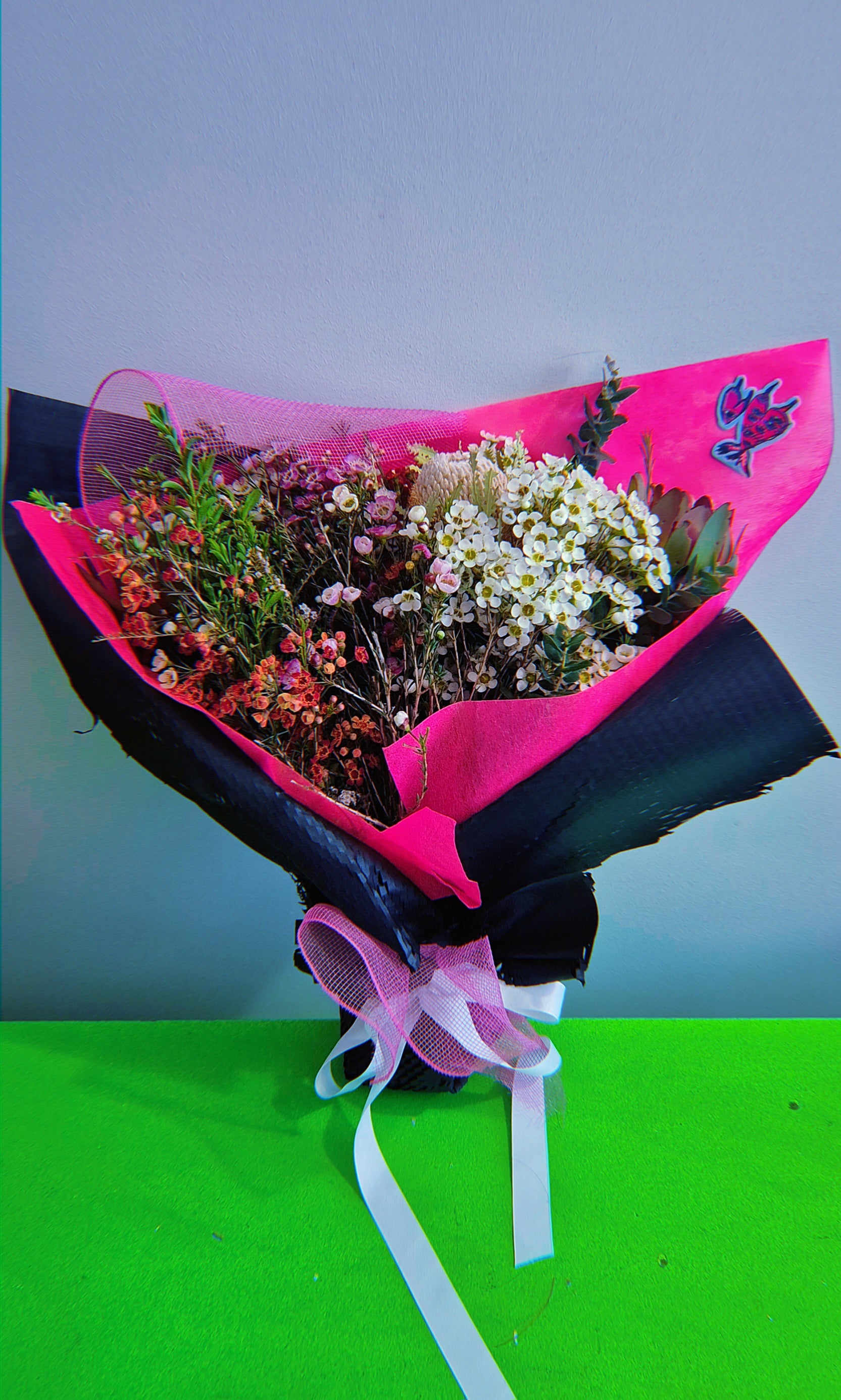 Please note, we will use the most available natives of the season so your bouquet may look slightly different to the images, but will be chosen with care and wrapped beautifully in our signature wrap. You can choose from hot pink, tiffany blue or deep purple wrap, set off by our stunning black (or white) outer wrap and a matching contrasting ribbon, by leaving us a message at check out, or just let us choose the wrap colours if you prefer.